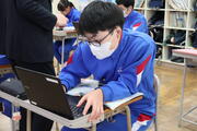 2年生理科は、「骨と筋肉のはたらき」学習。腕には32本の骨(実物を使って)があって、52本の筋肉があることを学びました。3年生英語は、「英作文」学習。「自然に対して私たちは何ができるのか?」とタブレットも使いながら書いていました。