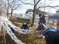今回は、骨寺村荘園交流館前と一関市博物館前で同時刻に飾り付けが行われ、二手に分かれての作業となりました。当日は雪が舞う厳しい寒さの中での作業でしたが、生徒たちは一生懸命飾り付けを行いました。今年は新たに2学年PTAが制作した竹あかりも加わり一層華やかな光に包まれました。